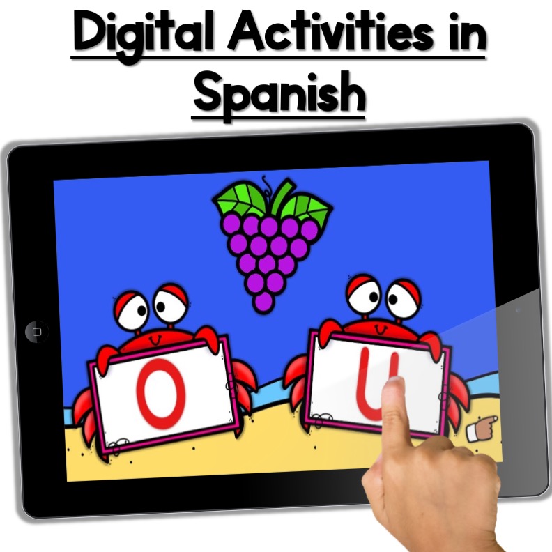 The game shown above is great for both teacher and student! This is because you can use it to help teach your kids vocabulary with initial sounds for the vowels in Spanish.